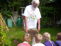 Das Interesse an der Natur muss möglichst frühzeitig, am Besten bereits bei Kindern und Jugendlichen, geweckt und gefördert werden. Auf diesem Foto zeigt der 1. Vorsitzende des Vereins Blühende Landschaft Großefehn Focke Focken den Kindern vom Kindergarten "Arche" und den beiden ersten Klassen der Grundschule aus Mittegroßefehn seine Bienenvölker. An einigen Schulen wie z.B. dem Ulricianum Aurich oder der Realschule Aurich wurde Schülern Wissen durch die Mitarbeit im Biologieunterricht vermittelt.